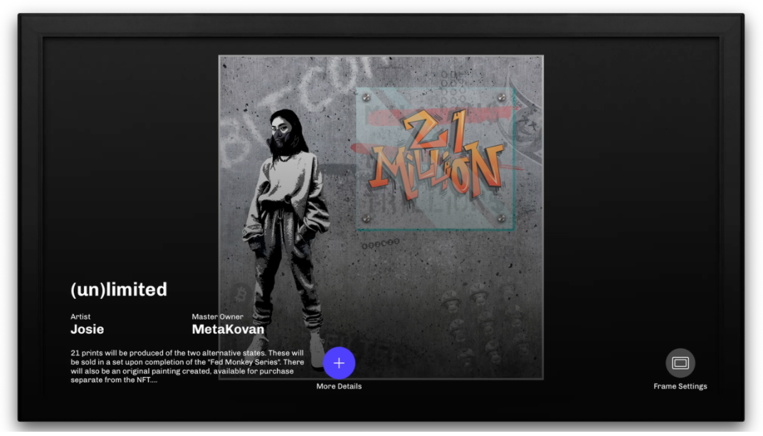 Digital displays are a great way to bring cryptoart into your day-to-day life. Simpler options like basic digital photo frames let you affordably adorn your living space with your choicest cryptoart. Then there are high-quality digital canvas solutions like Infinite Objects and Meural that can beautifully showcase your NFTs. TV-centric displays, like via the Apple TV system, have also grown increasingly popular among cryptoart collectors since last year.
