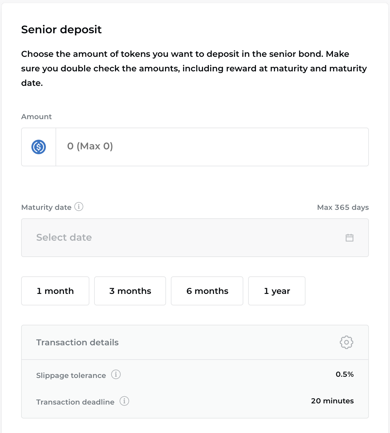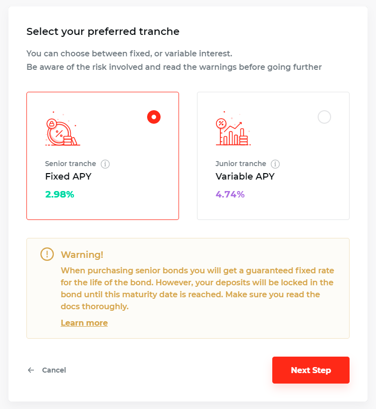- You’ll now be asked to pick your preferred tranche. Select the Senior tranche Fixed APY option. Before proceeding, keep in mind that “your deposits will be locked in the bond until [its] maturity date is reached.”