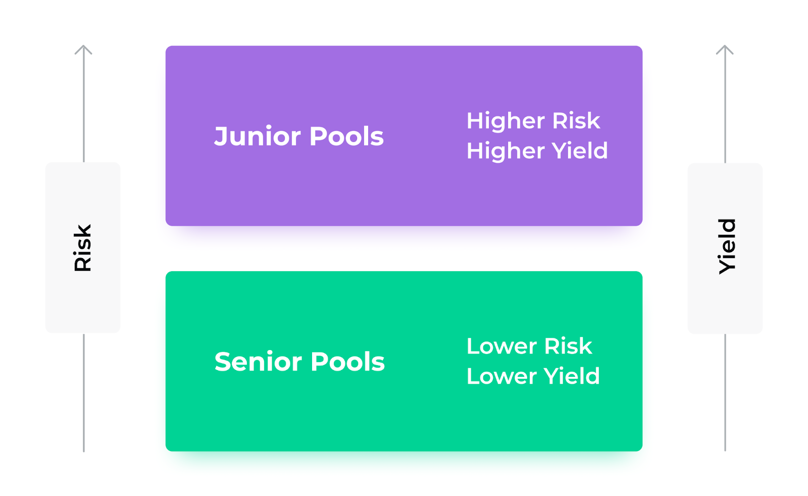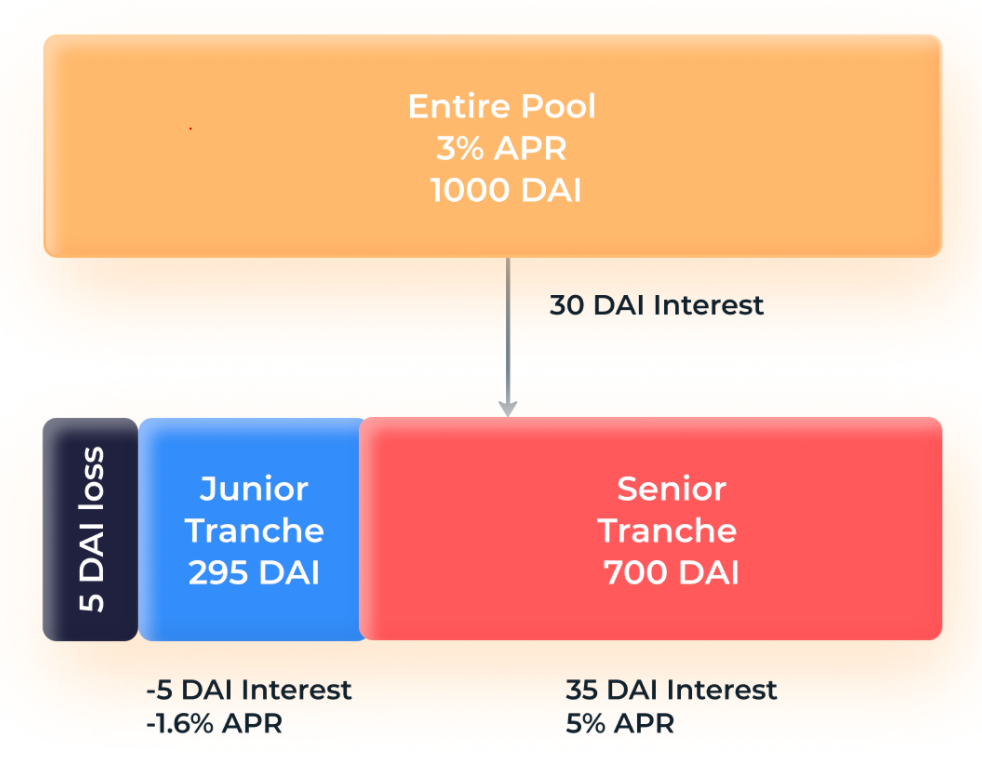 In practice, this means BarnBridge pools deposits and splits yields preferentially between two sides of users, a senior side and a junior side.
