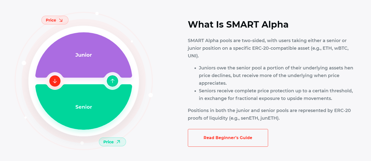 SMART Alpha doesn’t provide its Senior bondholders with fixed-rate interest. Rather, the product distributes yields on a fluctuating basis per junior-side pool dominance, i.e. “the share of a given ERC-20 token’s pool that is composed of junior depositors.”