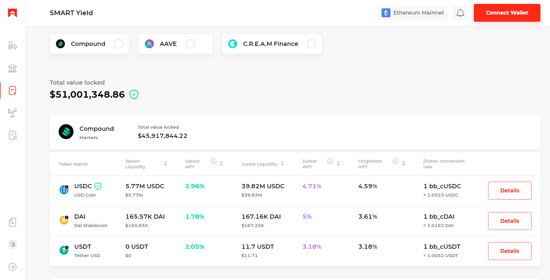 In other words, SMART Yield provides investors with fixed-rate or levered variable yields on their stablecoin deposits. The system aggregates users’ deposits into Aave, Compound, and C.R.E.A.M. Finance and tranches the ensuing yields into senior and junior risk profiles.