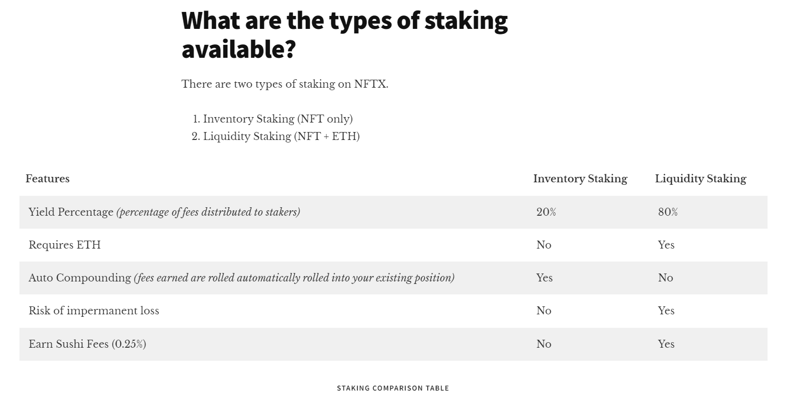 A side-by-side of inventory staking and liquidity staking on NFTX: