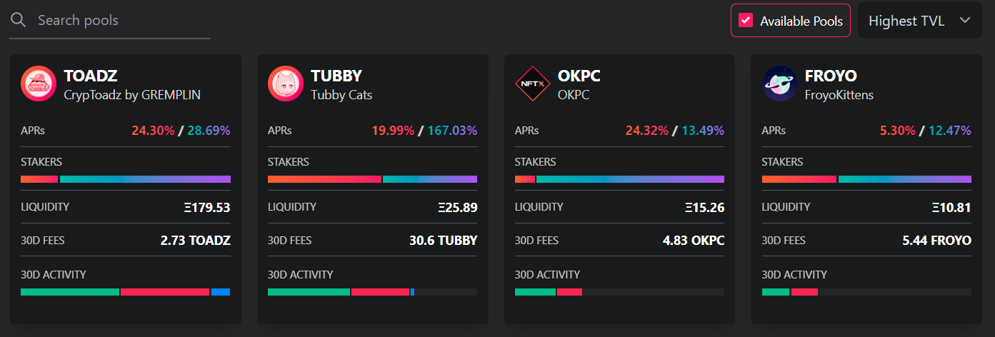 - Connect your wallet, and then press the “Available Pools” button to browse the NFTs you can deposit