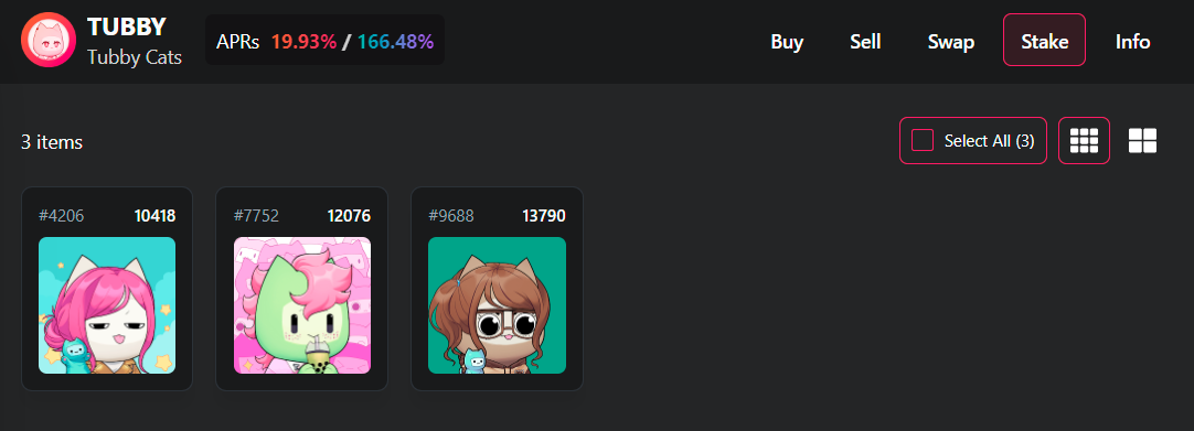 - Click on your desired collection and then choose which NFTs you want to stake from your stakeable assets — only choose NFTs you’re okay parting with, because someone may purchase what you stake, meaning you’d have to redeem a different NFT if you wanted to withdraw)