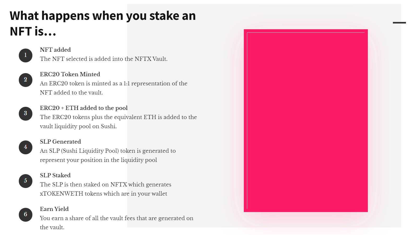 This liquidity approach entails LPs minting ERC20 tokens that are 1:1 representations of the NFTs that they add to NFTX vaults.