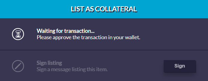 - When you’re ready to proceed, press “List as Collateral.” A prompt will pop up on your MetaMask to approve the NFTfi transaction. Confirm this transaction, and then sign the ensuing message with your wallet that formally lists your collateral.