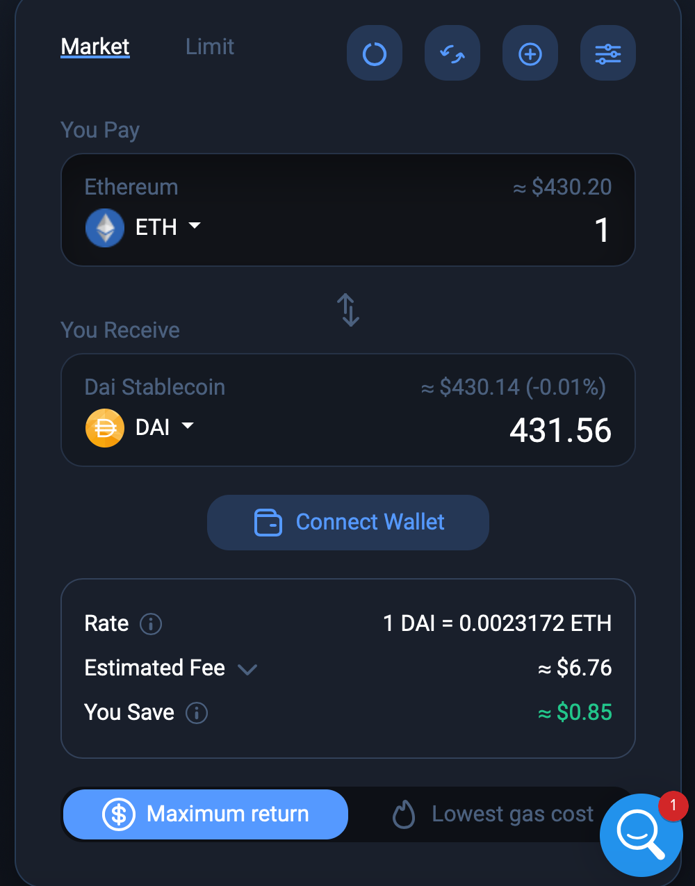 Traders can choose between the ‘Maximum return’ and ‘Lowest gas cost’ options. If you choose the ‘Maximum return’ option, the algorithm will use complex routes for the swap to make sure that you get the best rates. Alternatively, you can go for the ‘Lowest gas cost’ option where the pathfinder algorithm will find the best option in terms of gas costs.