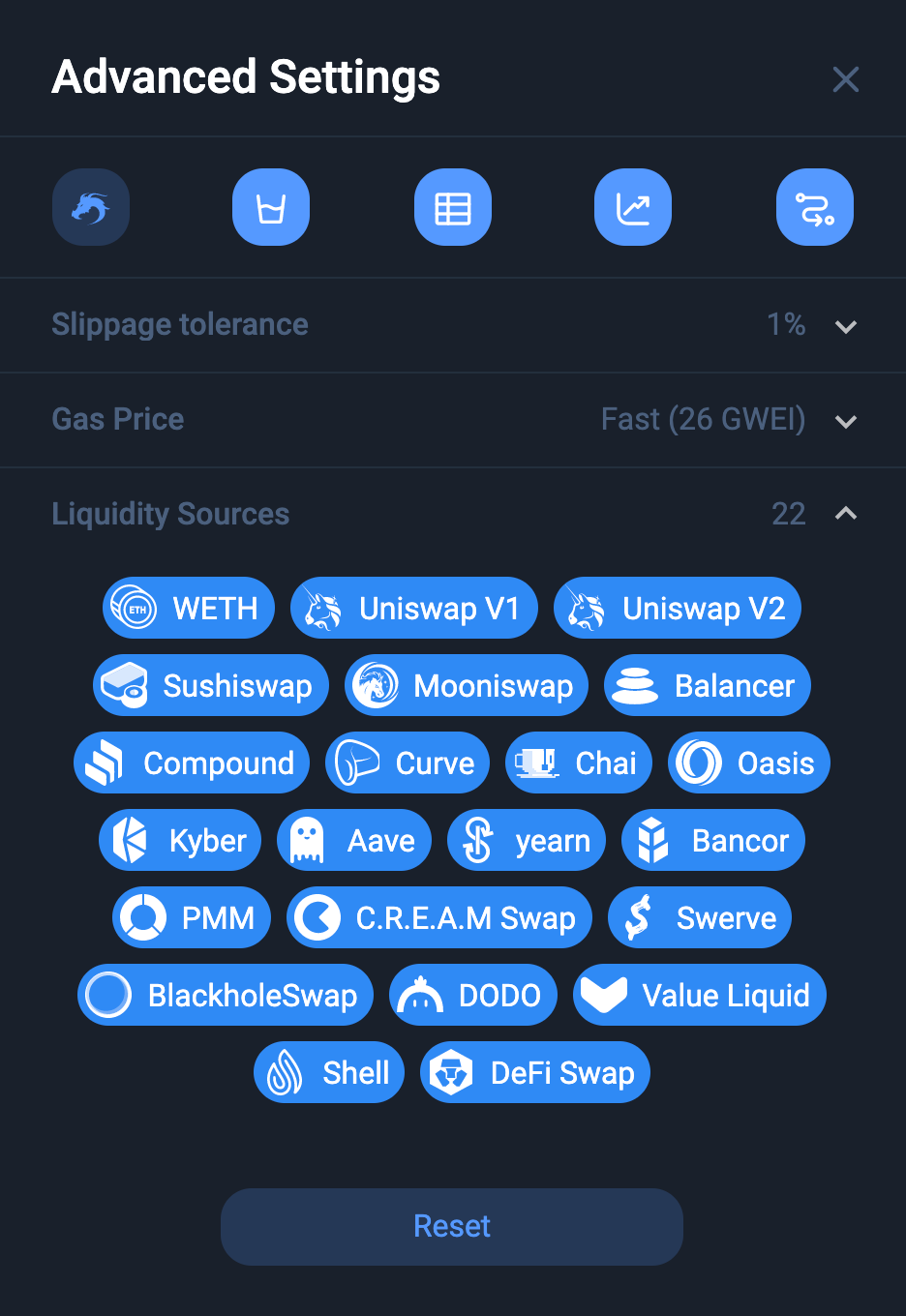 The ‘Activate CHI’ button on the left allows you to enable 1inch’s CHI gas token which can reduce gas costs by 43%! In order to activate and receive the benefits of CHI, the user should begin with a CHI balance of at least 5 CHI.