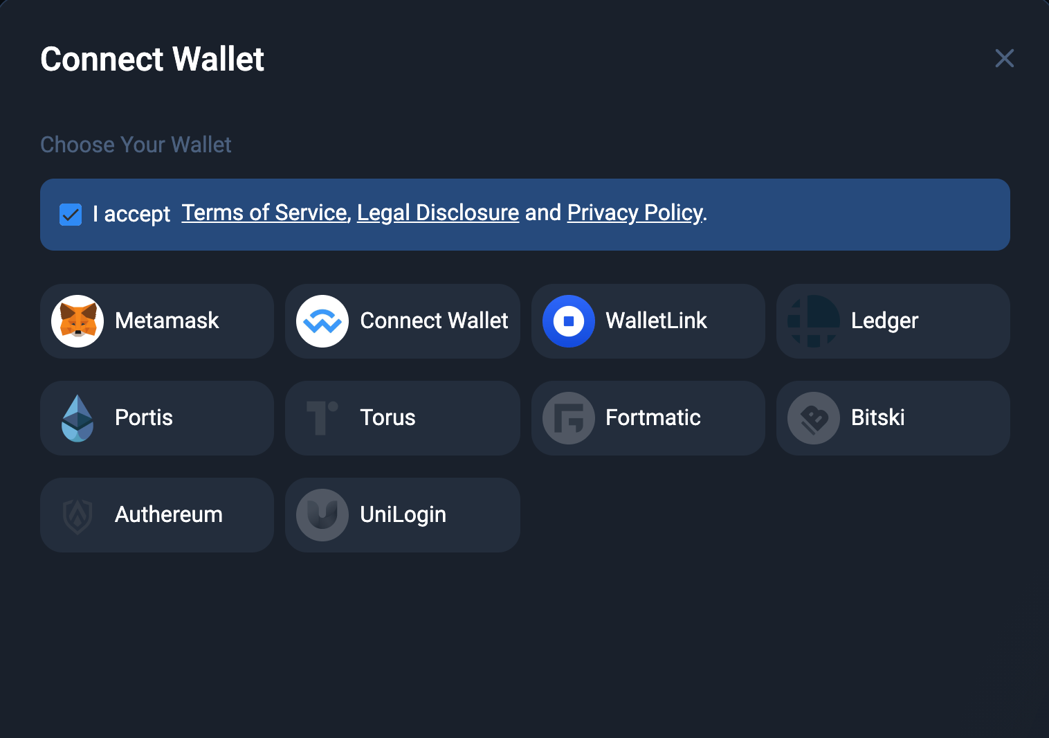 Step 1: Connect your wallet by going to 1inch Exchange. Click on the ‘Connect wallet’ button in the upper right corner and make sure to read and accept Terms of Service, Legal Disclosure and Privacy Policy.