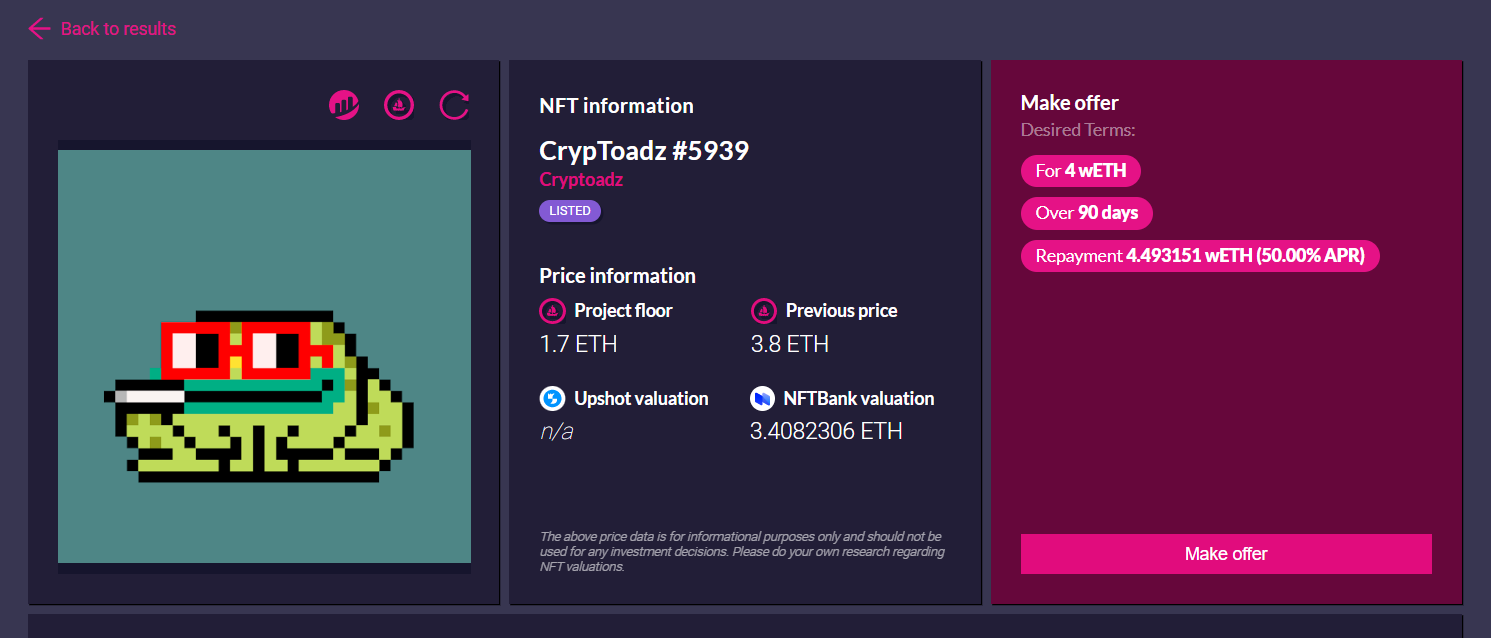 The advantage of this approach is that it lets you totally customize and opt-in to your NFT loan parameters. The downside is that it may take a long time, if ever, to find someone willing to take up the other side of your loan.