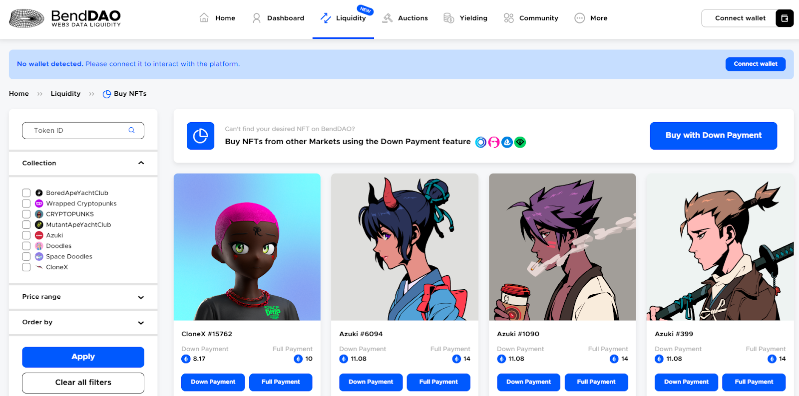 - BendDAO currently accepts deposits of Azuki, BAYC, CloneX, CryptoPunks, Doodles, and MAYC NFTs - if you have one of these and want to proceed, press the “Deposit” NFT button