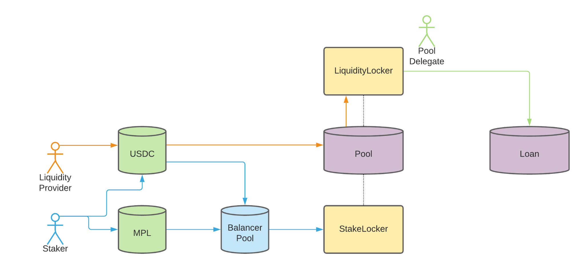 - Stakers — Users who provide USDC and MPL liquidity to Maple’s Staking Pool, an insurance-centric Balancer liquidity pool, and then stake their ensuing BPT tokens. These tokens will be liquidated first in the case of defaults to protect Maple’s credit markets, so stakers earn a cut from borrowers for providing a backstop.