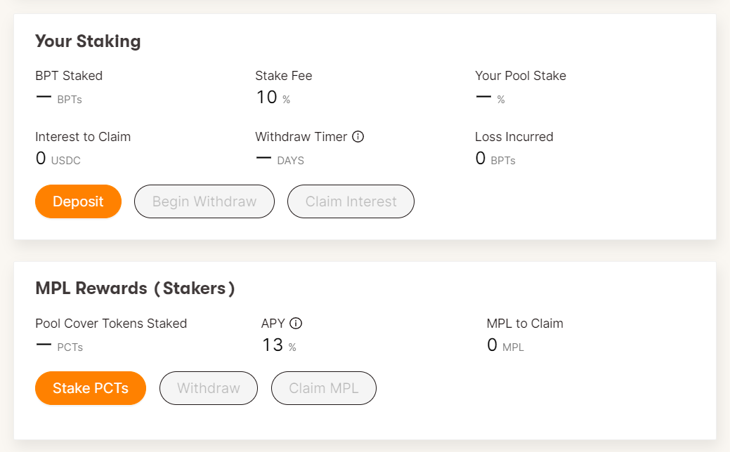 Then you’d take your BPT and stake them your Maple pool dashboard to earn interest via USDC. After you stake your BPT, you’ll receive Pool Cover Tokens (PCTs), which indicate your cut of the staking reserve.
