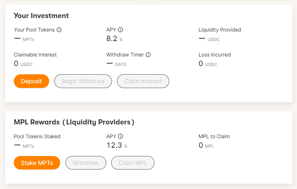 Both pools are currently offering depositors +20% total APYs, which come via both interest payments and MPL rewards. To join these pools you’ll need three things: ETH for gas, USDC for depositing, and a MetaMask wallet for interacting with Maple.