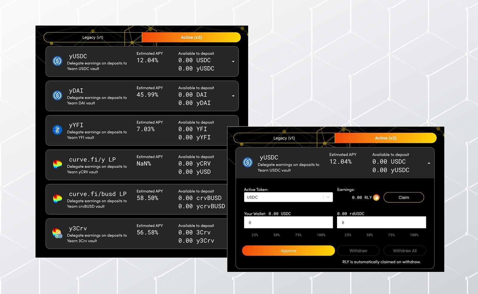 Each YDV accepts both yearn tokens (i.e. yUSDC, yDAI, etc) and the underlying token (i.e. USDC, DAI, etc) as deposits. Go to https://vaults.rally.io/vaults to access the YDVs and claim any $RLY accrued over time.