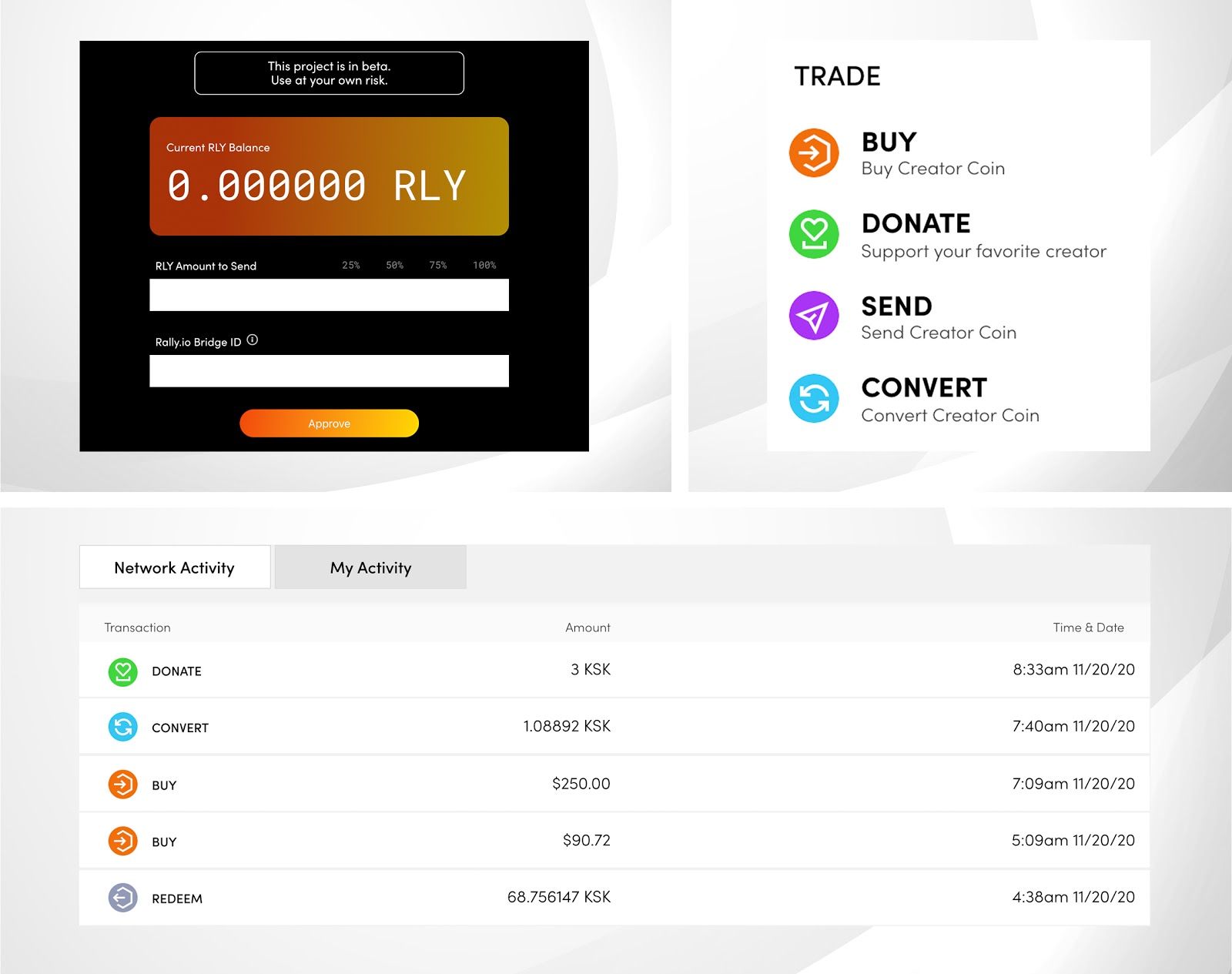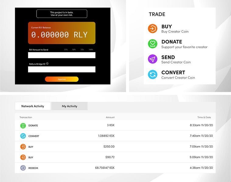 Aside from purchasing Creator Coins using a credit card or select crypto assets like BTC, Ethereum users can also stake RLY into a bridge contract to receive RLY on the Rally.io sidechain (1:1 ratio with mainnet RLY) which can then be “converted” into Creator Coins.