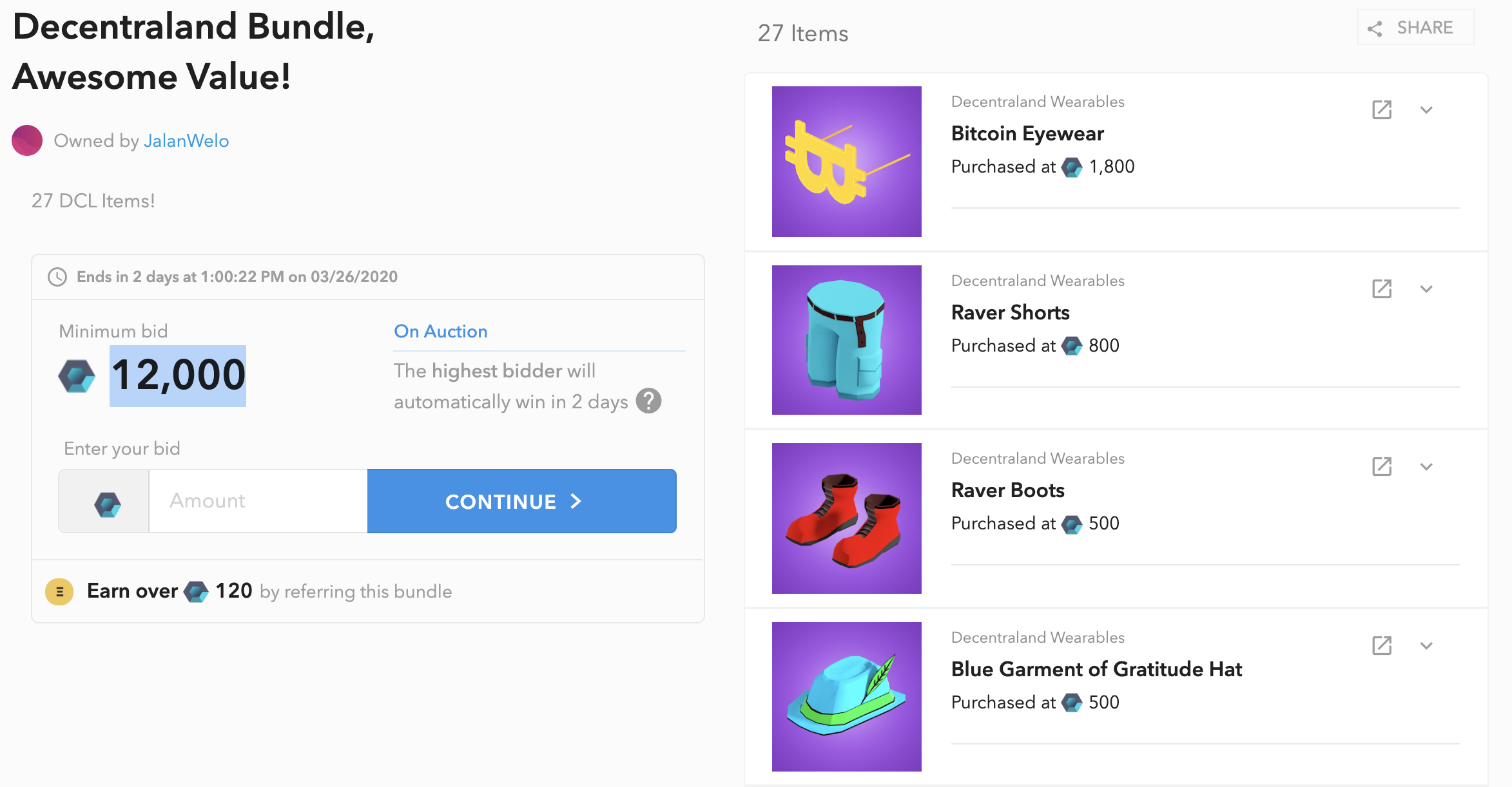 (Above) Decentraland Bundle of items and names—12k Mana starting price is over $360!