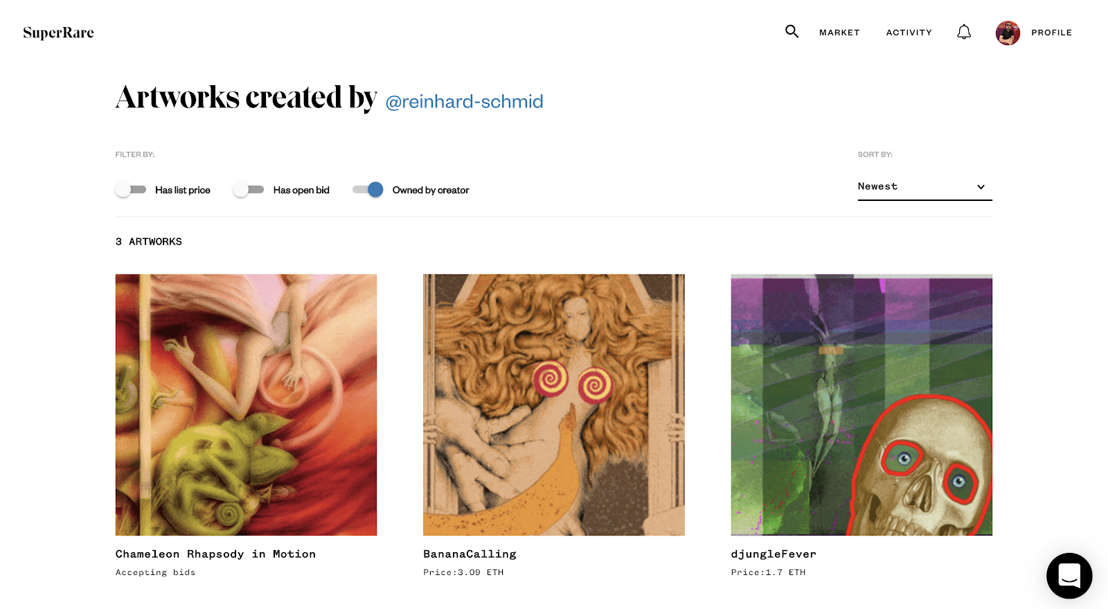 After getting a high-level view of the artists’ stats, click into the profile and collection pages of 3-4 individual artists to learn more about their style, their price history, and how many pieces they own out of their total supply. For example, here is the collection page of artist Reinhard Schmid, who at time of writing owned three works out of 25 created.
