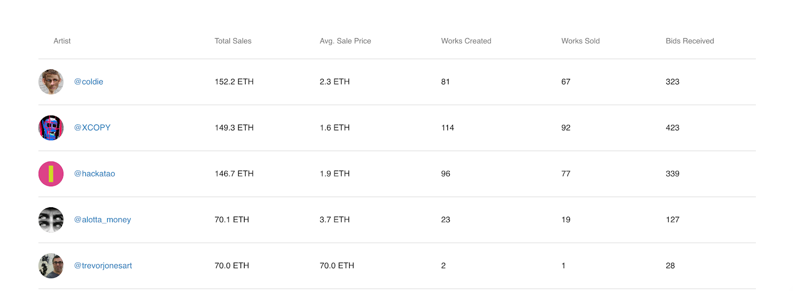 Once you’re a bit more familiar with the market, it’s time to look over the all-time artists’ stats page to get a sense for artists’ token supplies, average sale price, and total number sold. The market has shown that artists that pay attention to scarcity and don’t flood the market maintain a higher average price, and their works generally maintain good value over time.