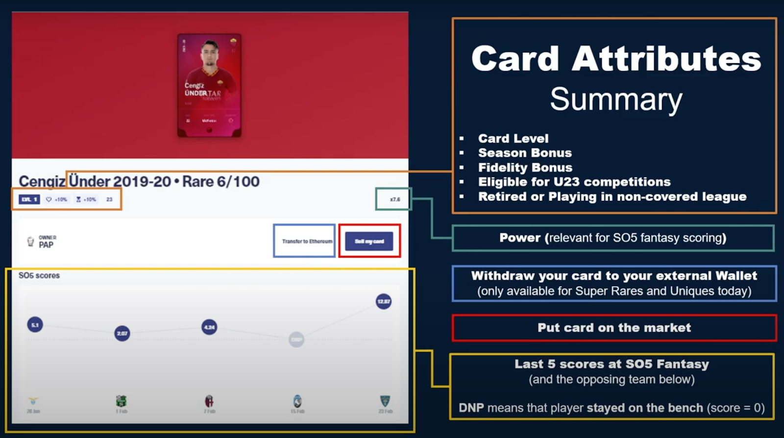 Here is a breakdown of the card attributes in a detailed video tutorial made by the Sorare Manager, PAP.