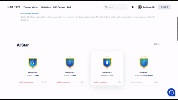 You will see a list of different divisions in which you can compete. The more power (i.e. scarcity and higher levels) you cards have, the more competitive you will be for the top divisions with the highest rewards.