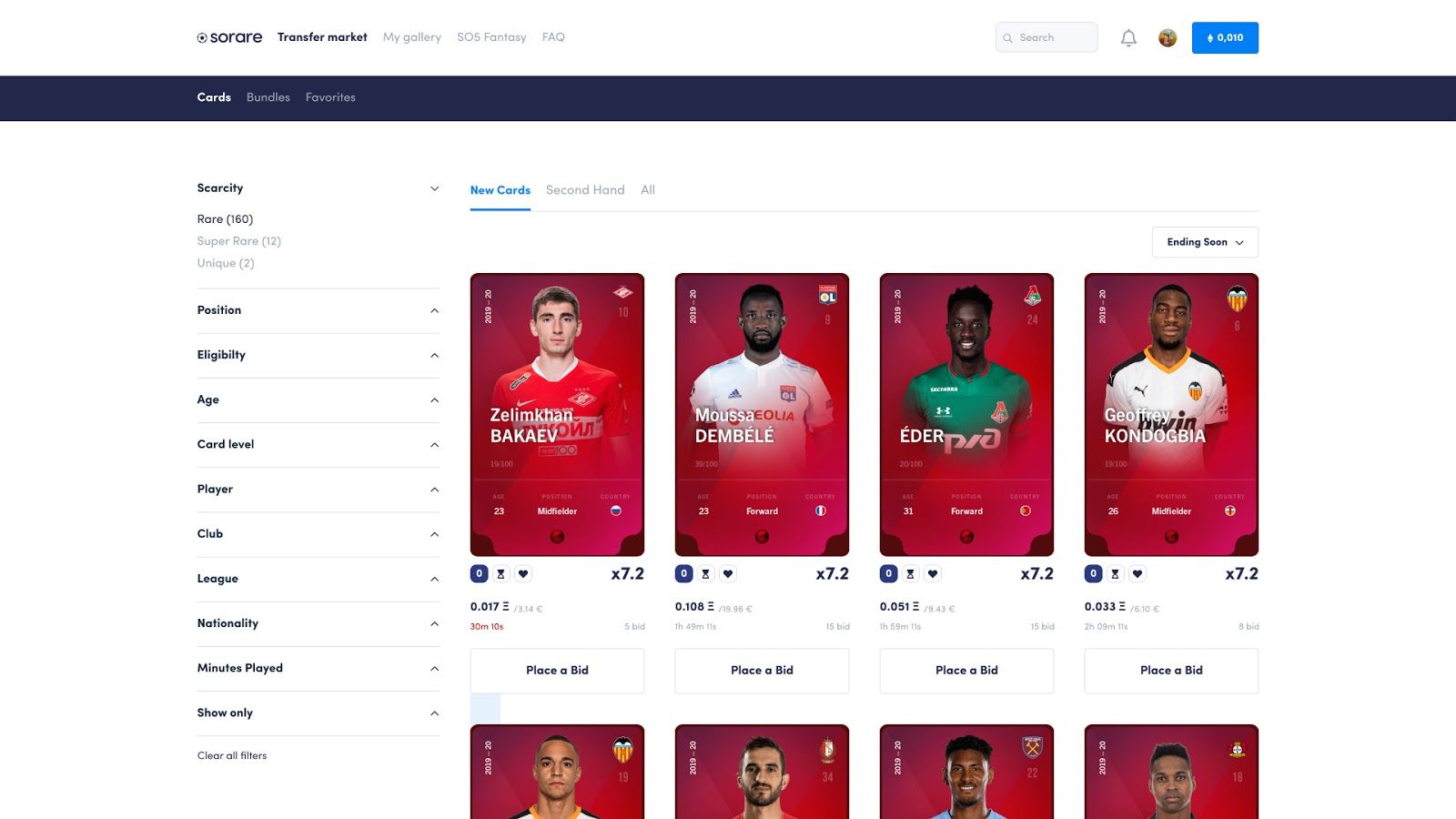 - Browse the new sales (new cards minted by Sorare) or the manager sales (this is the P2P market where you will be able to resell your players)