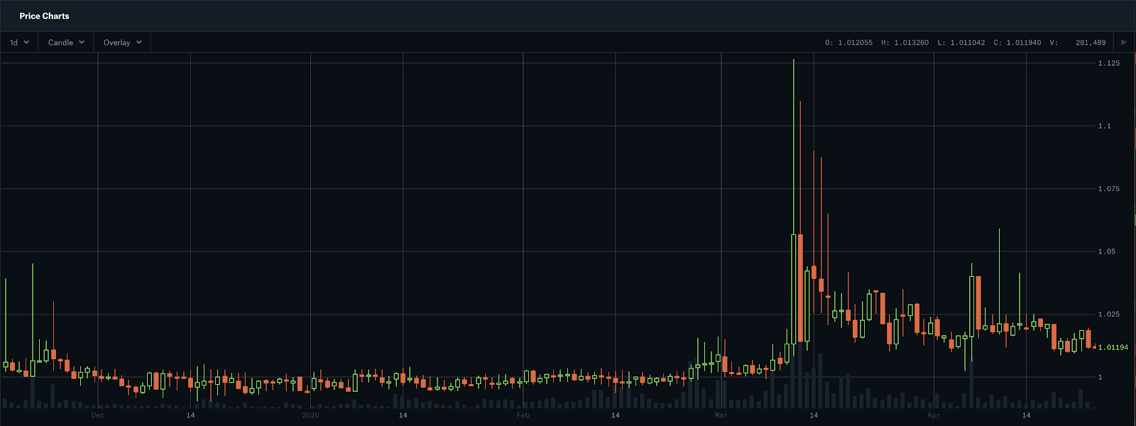 Since the ‘Black Thursday’ crash in cryptomarkets in March, DAI has been trading decisively above $1. The chart below shows the Coinbase market, which displays the price of DAI in USDC, a 1:1 dollar-backed stablecoin. As we can see, in mid-March traders paid over $1.05 per DAI and the current price is $1.01194.