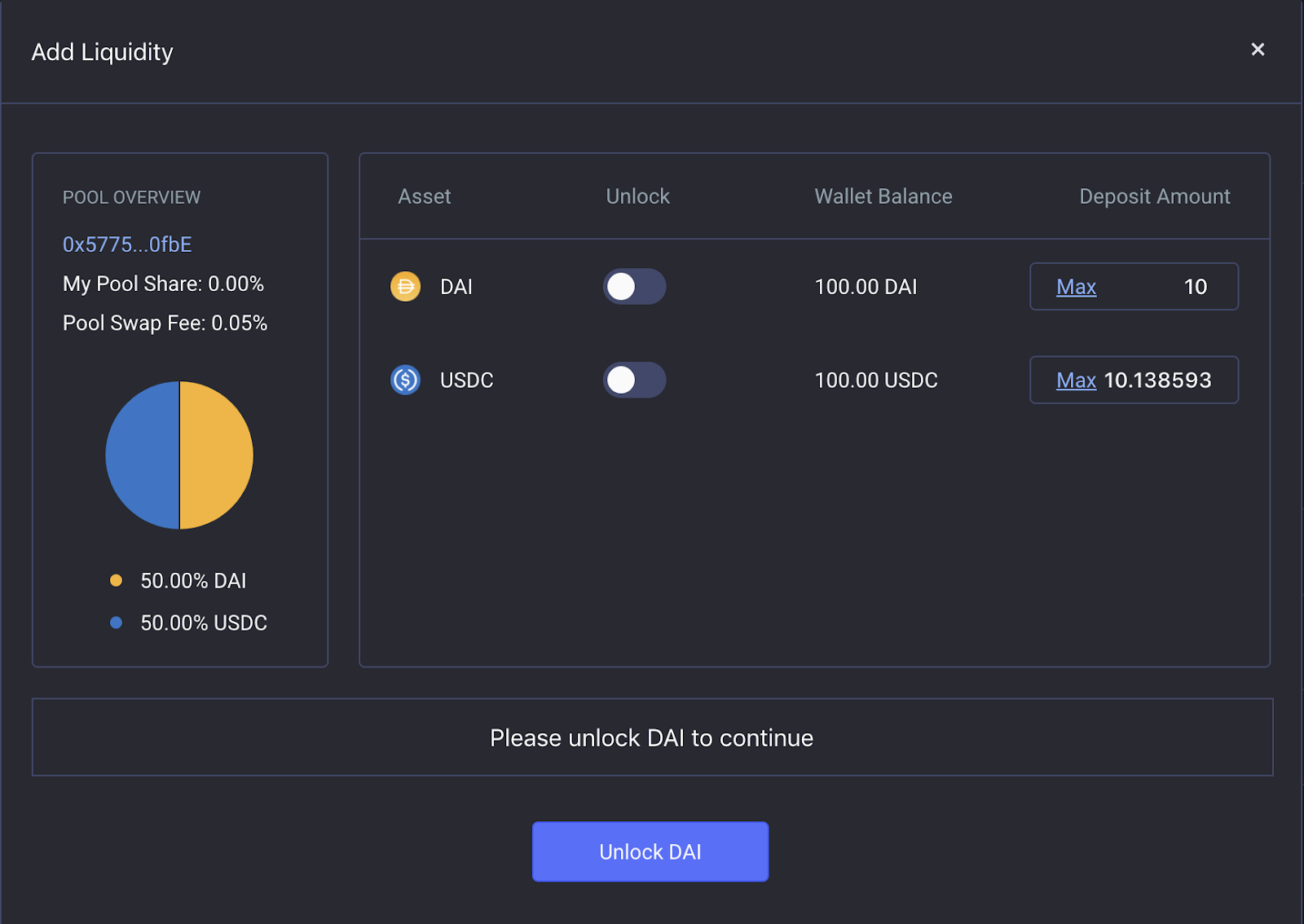 - Wait until DAI becomes expensive relative to USDC and deposit both assets into the pool. For example, in the screenshot below we would need to deposit 10 DAI and 10.1385 USDC into the pool. (Optional step for power users: create a Maker Vault and issue DAI, use it to buy USDC so you end up with the 50/50 ration you need for the Balancer pool. If you are bullish on ETH, you can create the vault with ETH collateral; otherwise, use USDC as collateral for the Vault.)