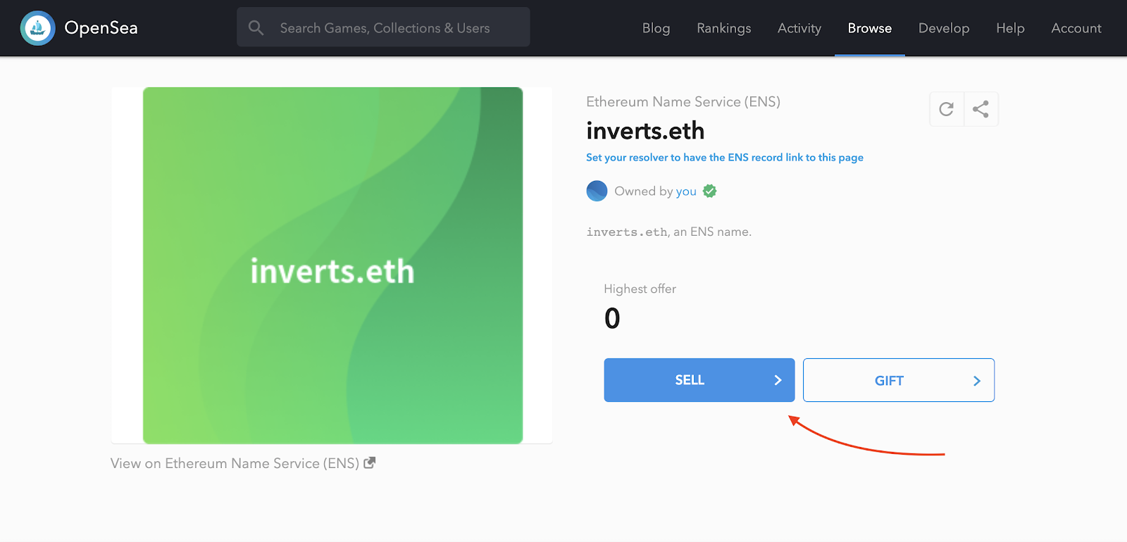 Now, let’s see about getting inverts.eth. At the time of drafting, it’s not for sale on OpenSea. It hasn’t even been registered yet. But by the time of publication, it will be, because I’m about to register and list it for sale.