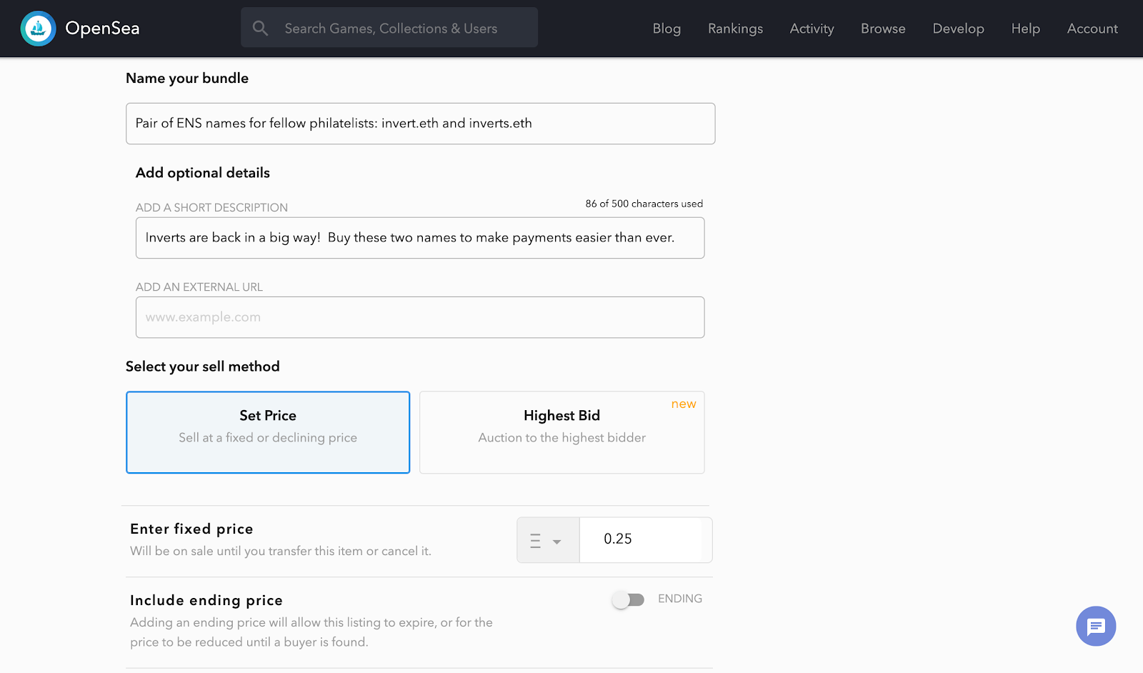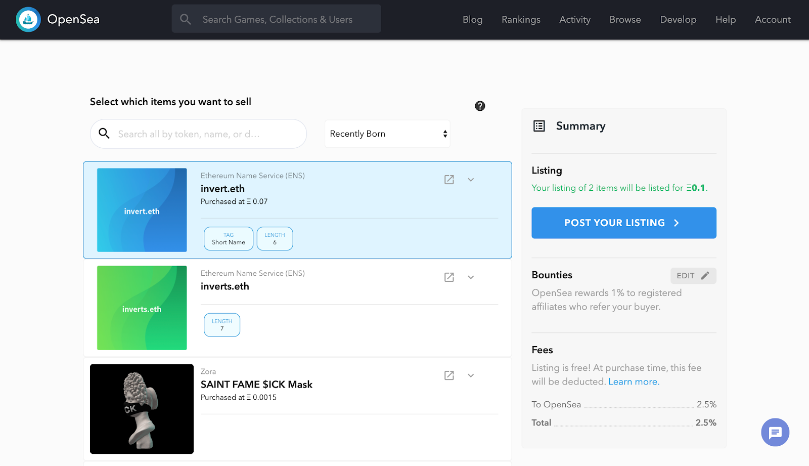Hover over the “Account” option in the navigation menu, then select “Sell a Bundle” from the dropdown list. On the bundling page, I’ll select invert.eth and inverts.eth from the list of tokens I own.