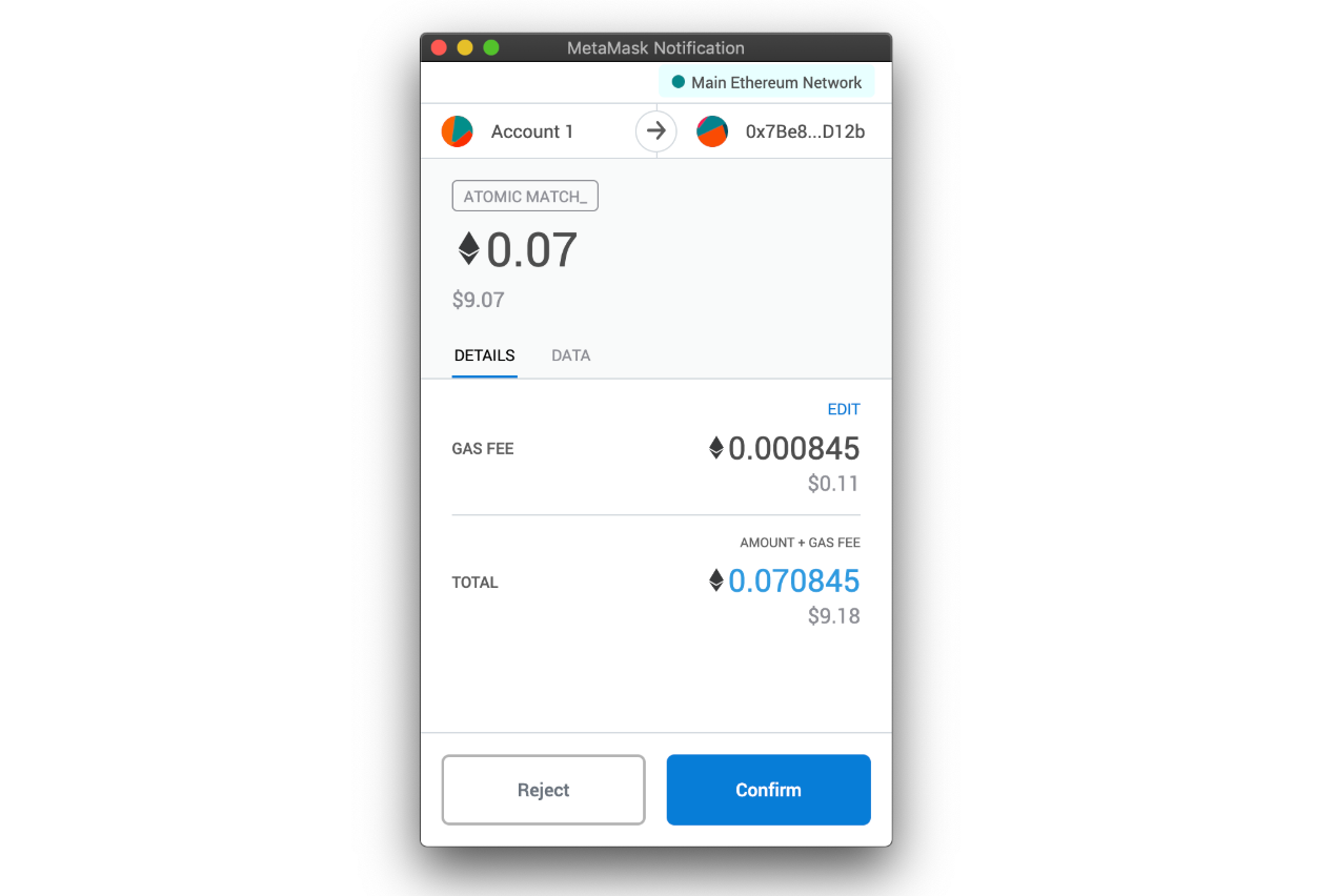 To purchase an item, click the “buy now” button. If it’s your first time transacting on OpenSea and the item is listed in a token other than ETH, you might have to do an initialization transaction approving the token for transfer before you can make the purchase. The popup for the actual purchase transaction looks like this: