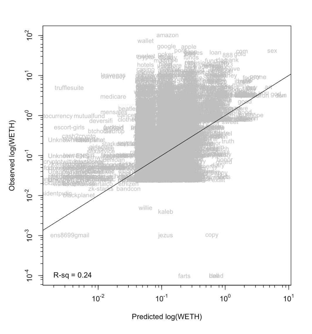 First and foremost, understand that size does matter. The shorter the ENS name, the higher the expected value, generally. Check out this tool by the anonymous data scientist Takens Theorem to get a sense of the relationship between length and price. A 3 letter name listed for 3 ETH is more expensive in absolute terms, but it might be a steal compared to a 6 letter name listed for 2 ETH. According to a blog post Takens Theorem wrote, name length can explain over 20% of the price variability.