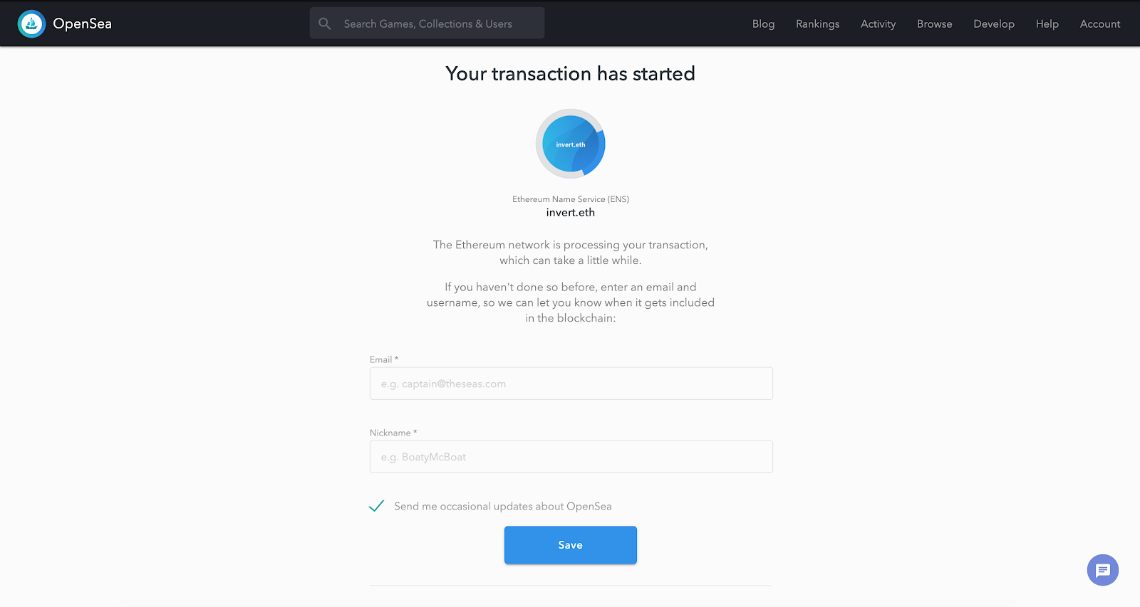 First, you set aside your frustration with the philatelic community for having lost their way and forgotten the true value of inverts for so long (I’ll stop making up stamp stuff shortly, I promise). You realize that before long, some enterprising stamp dealer will create an online shop selling exclusively inverts and they’ll want to accept ETH. But they’re not going to request payment to a big ugly Ethereum address. They’re going to want a nice, snappy ENS name. So, I’m headed to OpenSea. Time to buy inverts.eth.