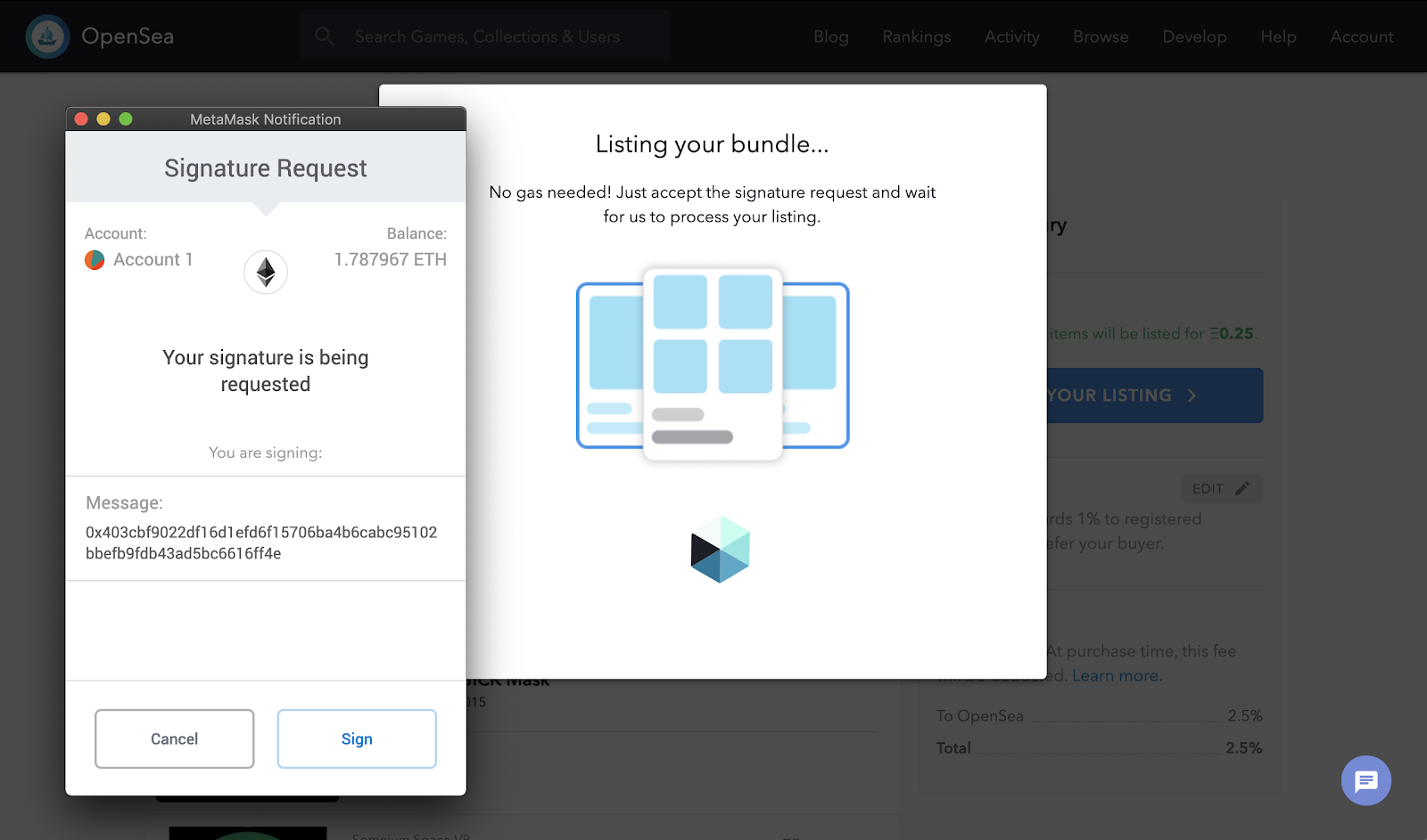 Finally, scroll back up to the summary, double check that everything looks right, and click “post your listing.” If it’s your first time selling something on OpenSea, you’ll get a few popups asking you to complete some initialization transactions. But if you’ve done this kind of thing before, you’ll only need to sign a single message.