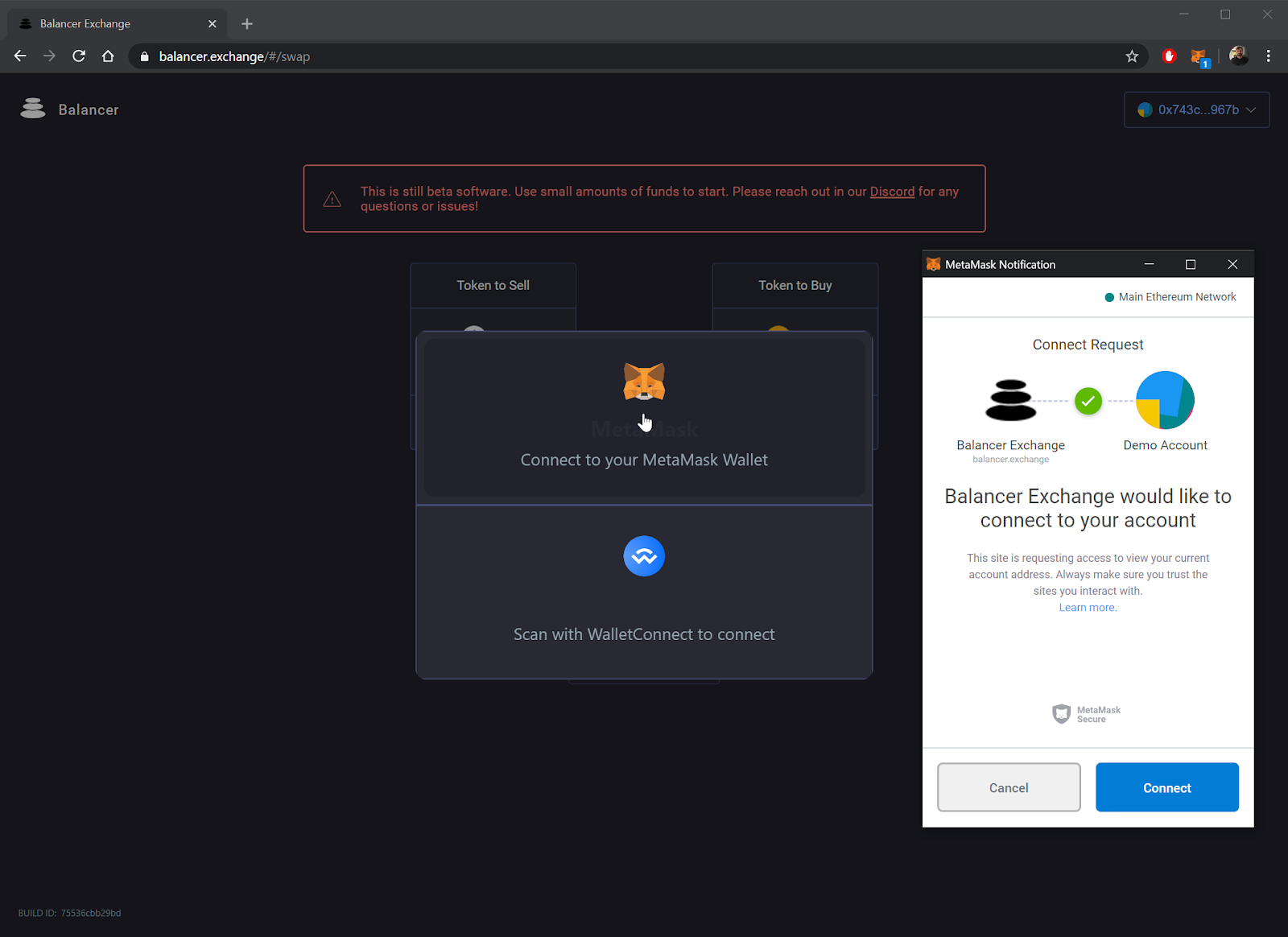 - Visit Balancer exchange and connect to your MetaMask Wallet or use WalletConnect.