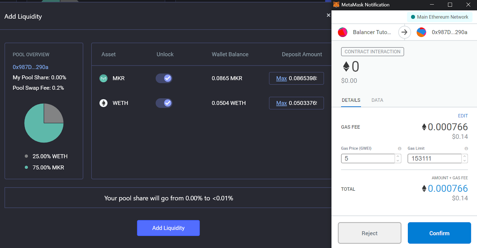 Click Add Liquidity and Unlock both MKR + WETH. What you are doing here is approving the Balancer pool contract to use your deposited MKR + WETH tokens. Each one of these approvals is a separate on-chain transaction but each one will only cost 45K in gas or $0.05 (assuming 6 gwei gas rates).