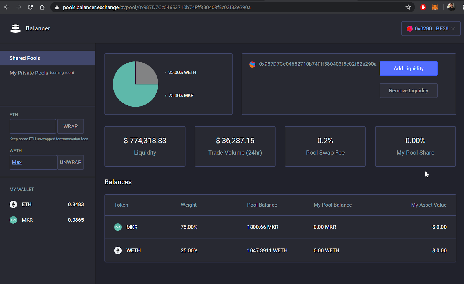 - Visit Balancer Pools and connect MetaMask Wallet or use WalletConnect. View available pools and choose which one you would like to add liquidity to. We will add liquidity to 75% WETH / 25% MKR Pool