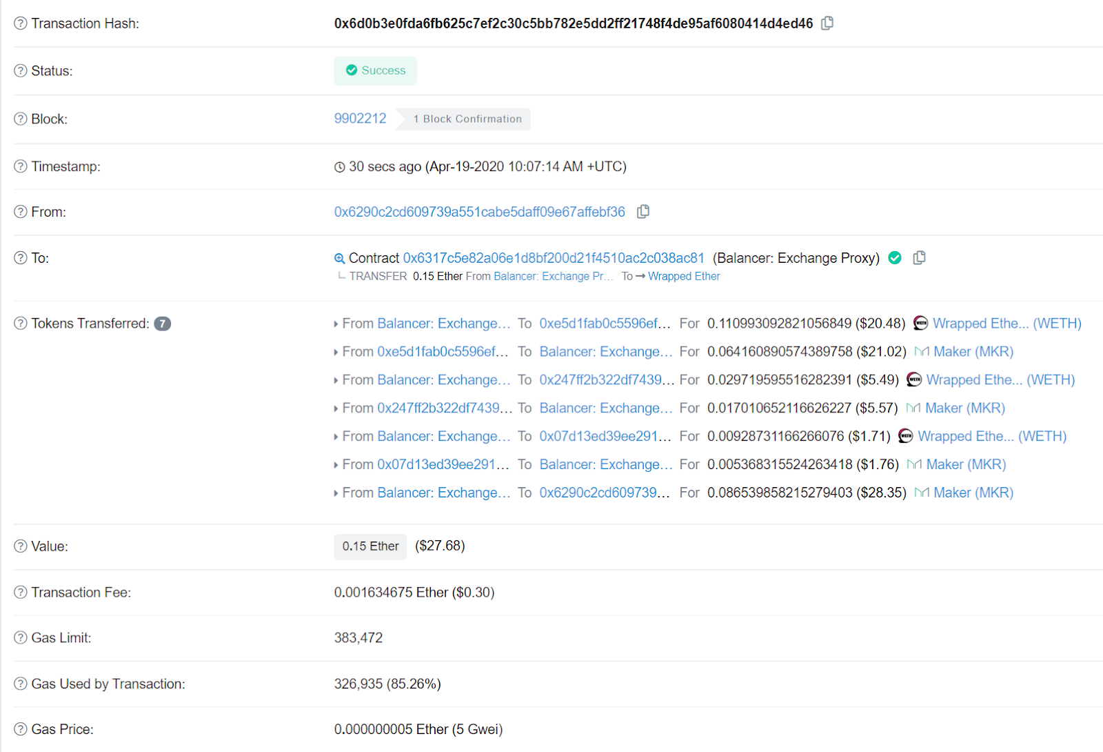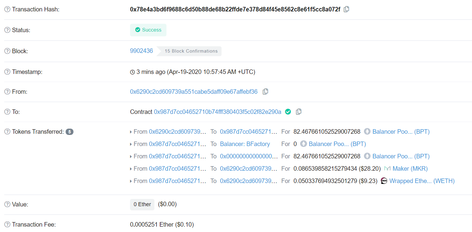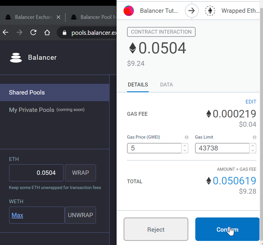 - Make sure you have appropriate proportions of underlying tokens required to enter your chosen Balancer pool. In our case we will be adding MKR tokens we received from our swap example (~0.0865 MKR). Since this pool is 75% MKR + 25% WETH we need to match our MKR tokens with ~0.0503 WETH tokens. Keep in mind, these are WETH tokens so if you have ETH, you will first need to wrap it into WETH. Again, this would be a separate transaction with gas cost ~45K.