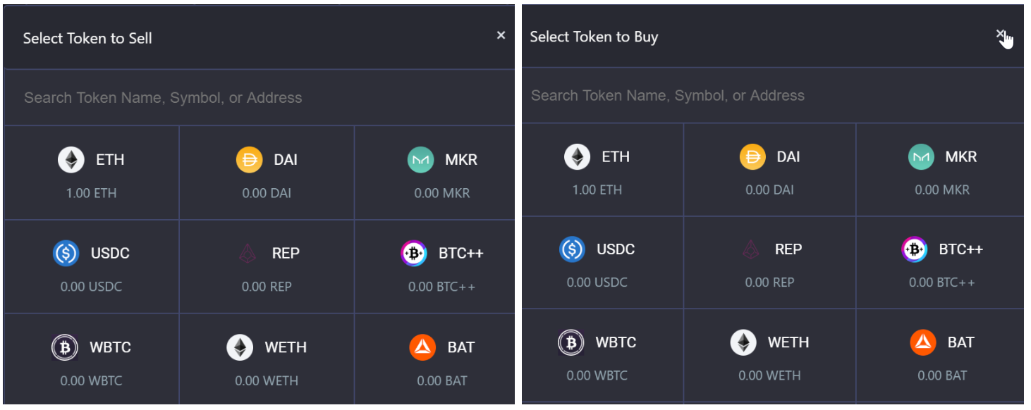- Choose which token you would like to sell and which to buy from a dropdown list of available assets or by entering Token Name, Symbol, or Address.