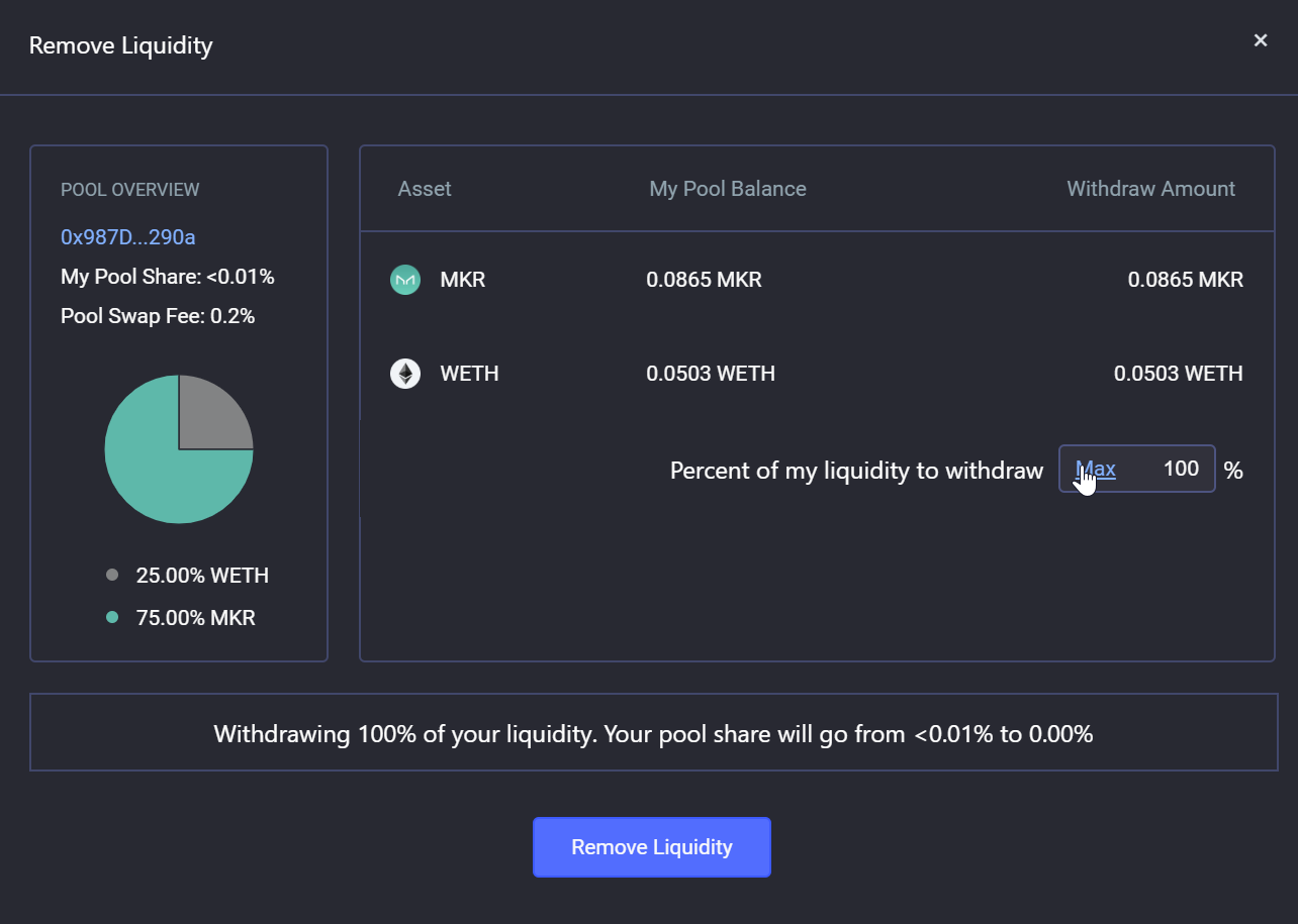 - Click ‘Remove Liquidity’, choose how much you would like to withdraw as % of total, and confirm with your Metamask.