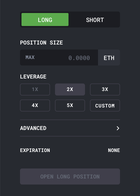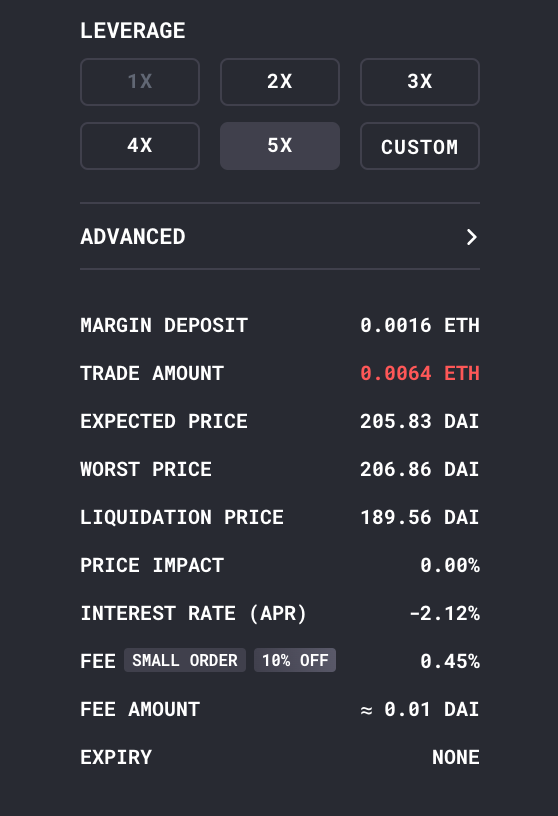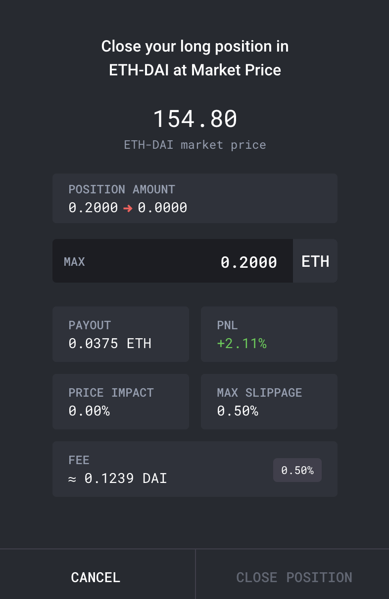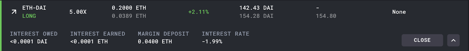 For example, let’s say you open a long on ETH-DAI with 1 ETH as your margin deposit, and when you close your position, you end up with exactly 2 ETH. Let’s also assume the price of ETH increases from 100 DAI to 200 DAI between the time you opened and closed the position.