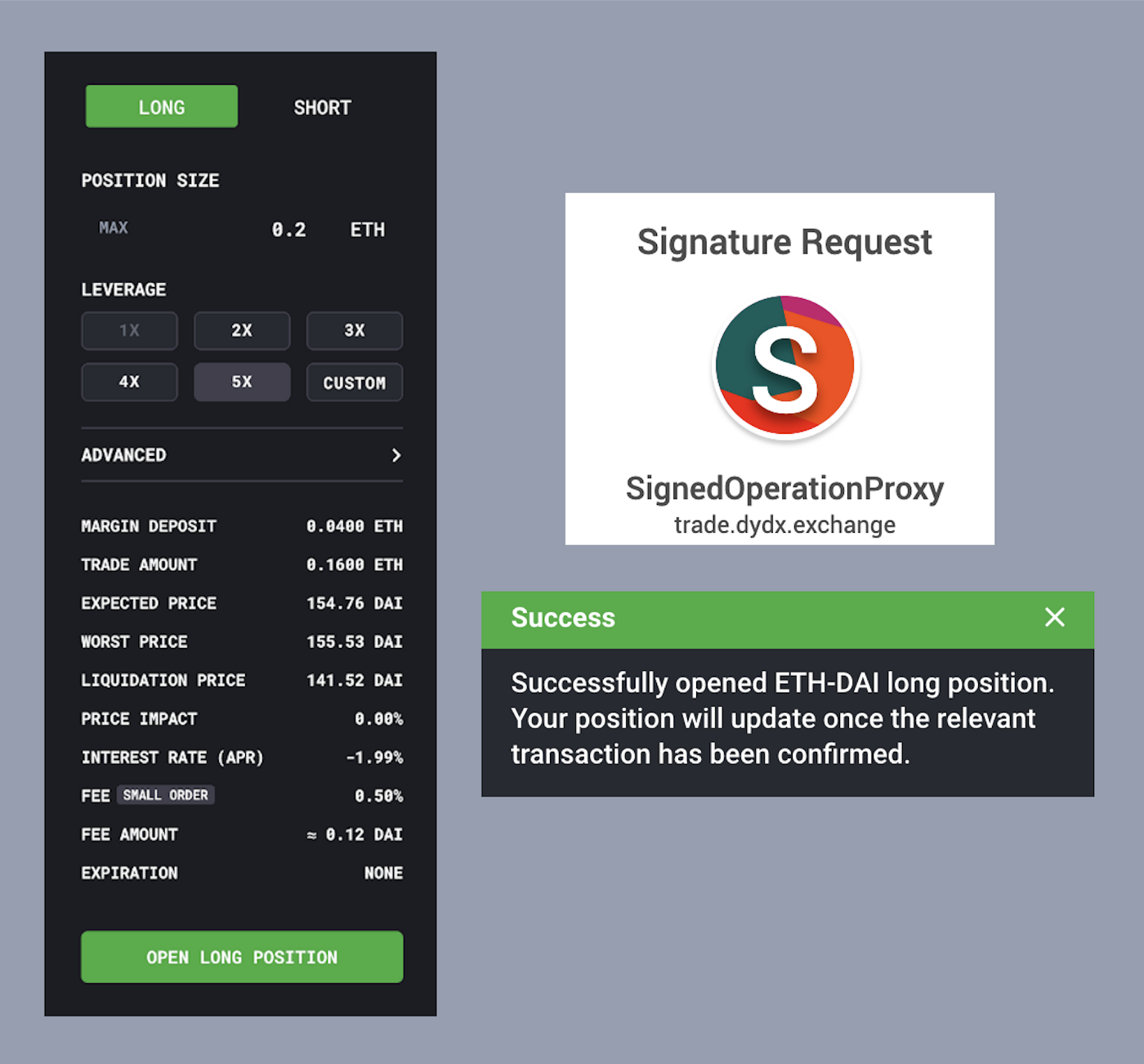 To open your margin position, you’ll need to have enough funds in your dYdX account to cover the margin deposit. For example, let’s say you want to open a 5X LONG position on ETH-DAI with a position size of 1.0000 ETH. The margin deposit for this position is 0.2 ETH, so you’ll need to have at least 0.2 ETH deposited in your account to open this position.