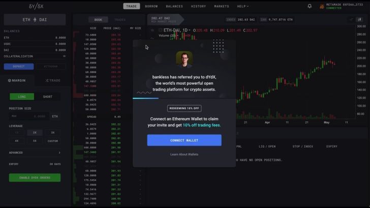 🥳10% discount on fees: dYdX has trading fees from .05% to .50% but Bankless readers can get 10% off dYdX fees by adding the Bankless code to their wallet.