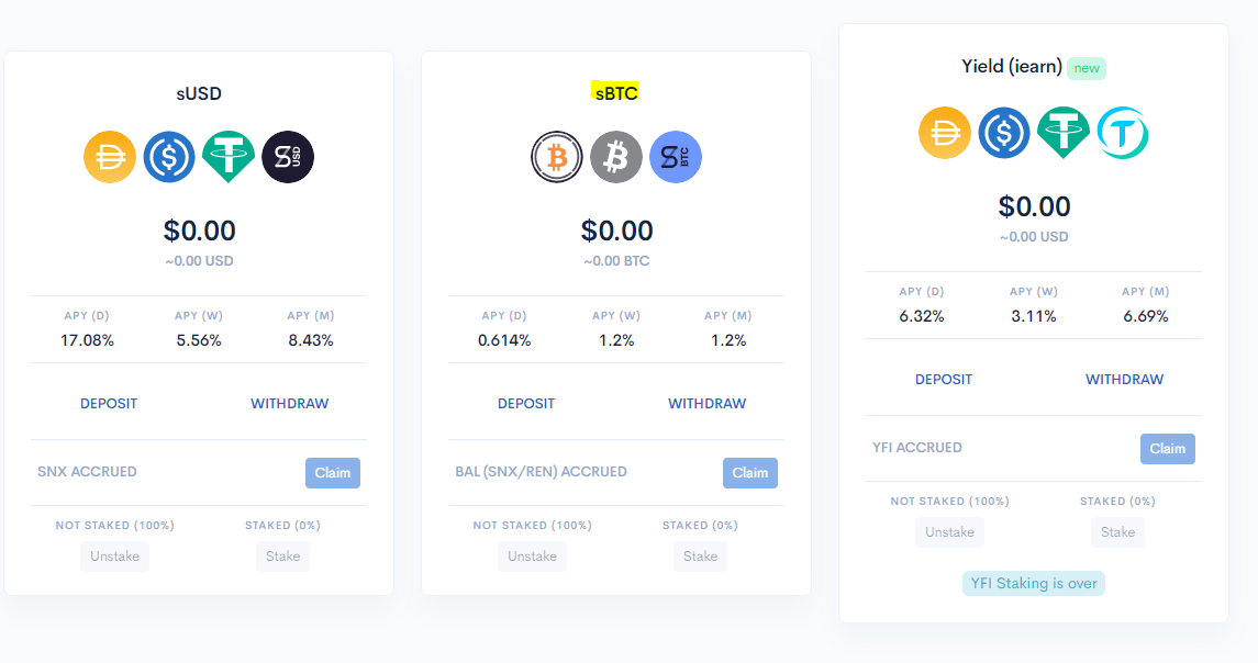 With the help of Curve’s sBTC pool, you can receive SNX, REN, and BAL on top of trading fees. This is one of the most diverse yield farming earning opportunities in the game today.