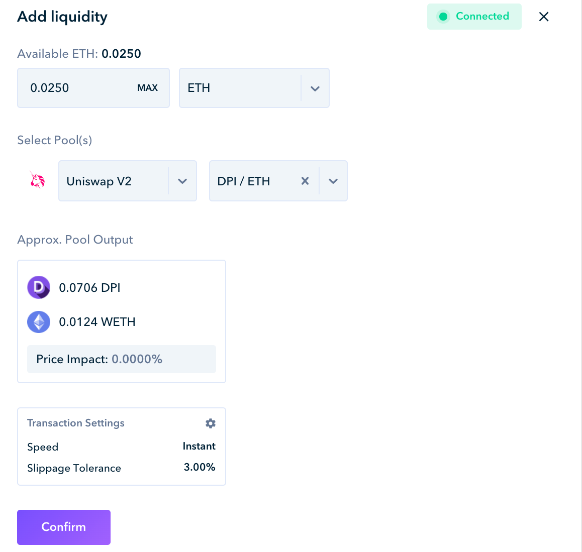 Once you’ve selected your desired asset to swap into DPI LP tokens, you can confirm the transaction at the bottom and via your wallet. After a few minutes, you should have DPI/ETH LP tokens in your wallet!