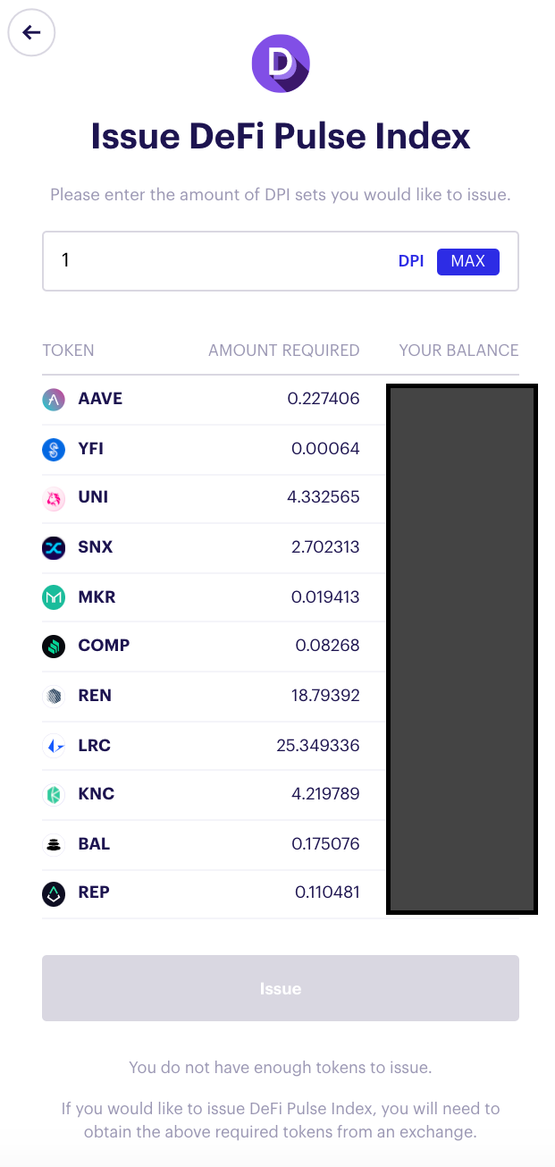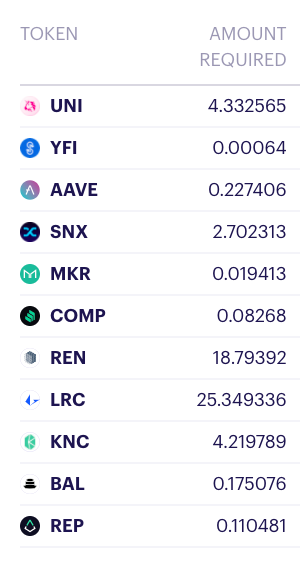 If you’d like to mint new DPI, it’s important to understand that you’ll need to hold all of the underlying DeFi tokens in your wallet. With that said, minting DPI is usually only a viable option for those looking to mint large quantities which would otherwise cause a significant amount of slippage on the open market.