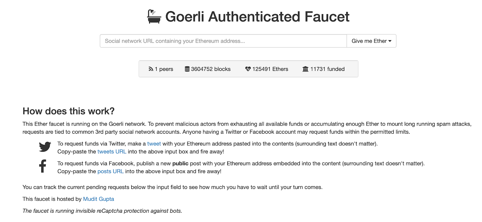- Once connected, head on over to the Goerli Faucet to get some test net ETH. You’ll have to post your Goerli testnet address on Twitter and paste the tweet’s URL into the search bar. Once completed, click on “Give me Ether” and the Faucet will take a few moments to verify the request and distribute your test net ETH.