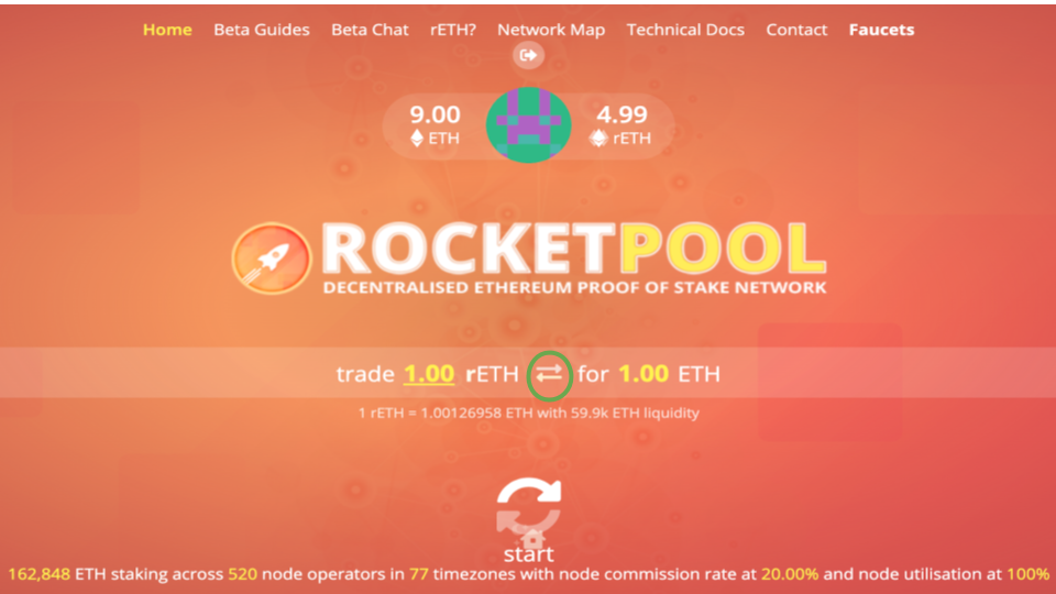 - Once you’ve received your Goerli ETH, go to https://beta.rocketpool.net/ and enter the amount of ETH you want to swap into rETH. For this tactic, we’ll trade 5 ETH for 4.99 rETH.