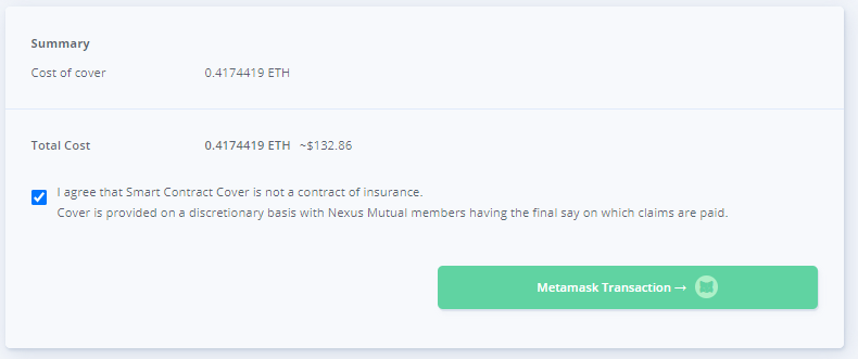 - Sign the Metamask transaction. Once confirmed, congratulations! You’re officially covered by Nexus Mutual for that smart contract.