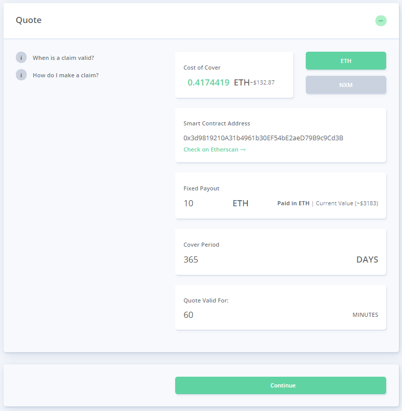 If you aren’t a Nexus Mutual member, you will need to sign up and become a member in order to get covered. However, anyone can query the mutual and receive a quote at any time.